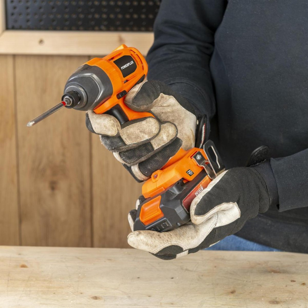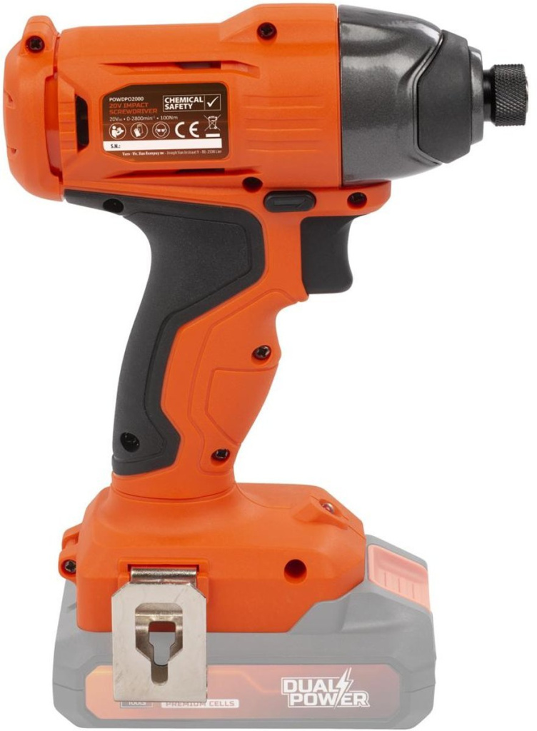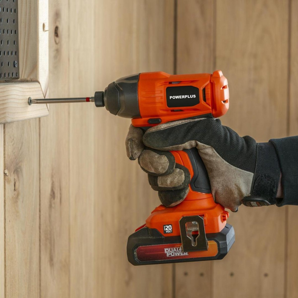 Tento AKU 20V rázový šroubovák POWDPO2000 od PowerPlus je ideální pro všechny projekty v domě a kolem něj, které vyžadují práci se šrouby. Tam, kde běžný šroubovák nestačí, může zabrat tento rázový šroubovák. Je všestranný pomocník, který lze použít jak pro lehké utahování, tak pro povolování. Snadno lze namontovat byty s připojením 1/4" HEX. Tento kompaktní Aku utahovák od Dual Power kombinuje uživatelskou přívětivost s vynikajícím poměrem cena/kvalita. Může dosáhnout maximálního utahovacího momentu 100 Nm. Vybírejte správnou rychlost pro použití mezi 0 min-1 a 2800 min-1, s frekvencí úderů až 0 úderů/min a 3000 úderů/min . Nástroj můžete přizpůsobit svému projektu. Upevnění/povolení: Praktický přepínač vlevo/vpravo použijte k upevnění nebo povolení šroubů. Ochrana proti přetížení zabraňuje přehřátí a přetížení elektromotoru. Automaticky vypne motor, když dojde k prudkému zvýšení teploty. Pokud se něco pokazí, rychlé zastavení okamžitě vypne nářadí, aby byl zajištěn bezpečný provoz za všech okolností. Pokud potřebujete mít volné ruce, můžete si nářadí snadno připevnit na opasek díky sponě na opasek. Praktické pracovní světlo poskytuje vždy jasný výhled na váš obrobek. Stroj je dodáván bez baterie a nabíječky. Použít můžete baterie ze série DUAL POWER o napětí 20V a také i baterie o napětí 40V. Použití 40V baterie zajišťuje ještě delší dobu chodu stroje ve srovnání s 20V verzí.