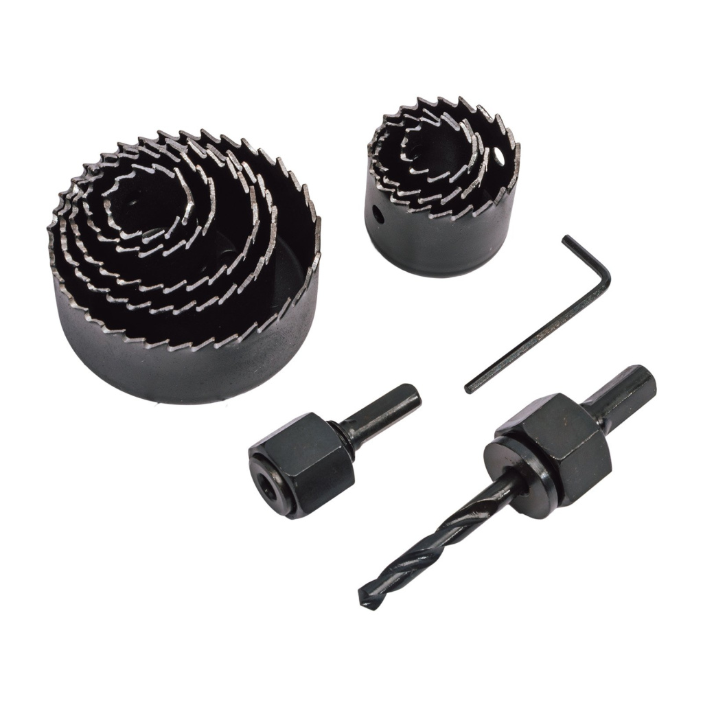 Součást balení: 2x unašeč + vodící vrták, imbus klíč, vykružovací korunky 19-64 mm