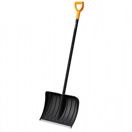 Plastová pracovní část je zpevněná hliníkovou lištou, sníh se na ní nelepí a skvěle se nahrnuje na lopatu.